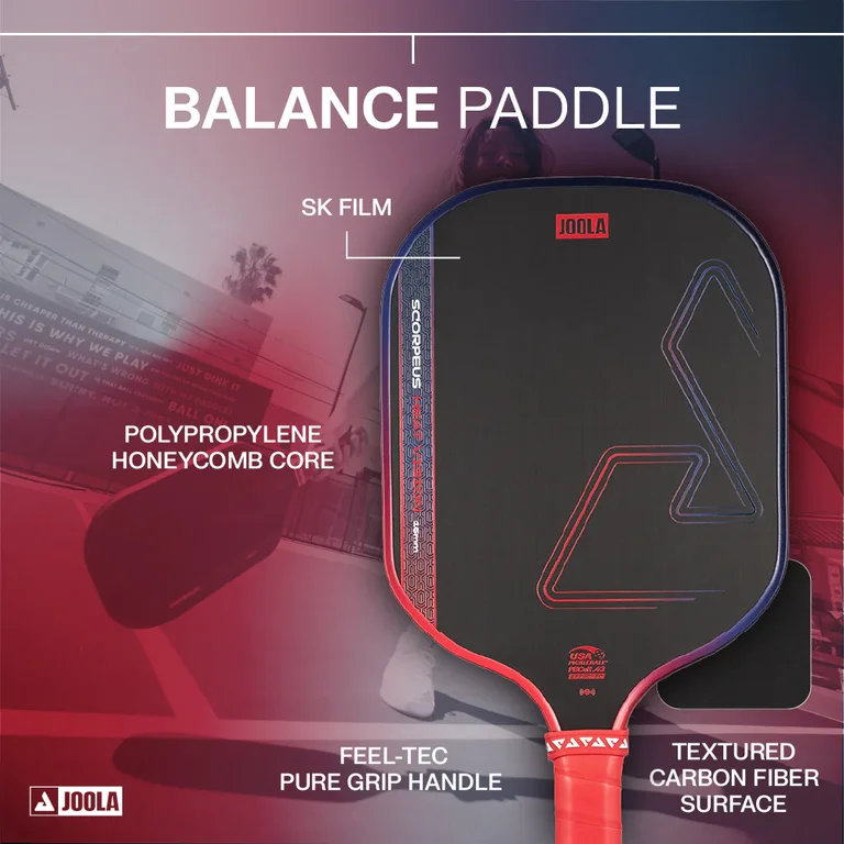 The Scorpeus Heat Vision 16mm is an excellent choice for defensive-style players while remaining versatile enough for those who excel in high-speed battles at the net. Inside, Heat Vision features JOOLA’s SK Film, strategically placed between the surface and core to dampen vibrations, reducing fatigue and extending playtime. A thermoforming process that runs from the paddle’s handle through the neck helps improve stability and flexibility.