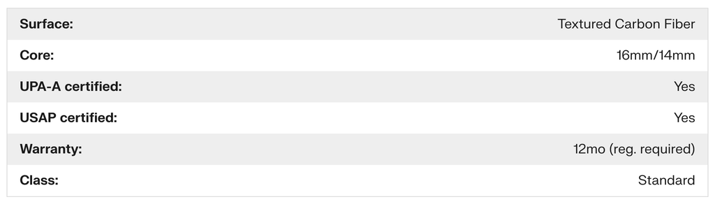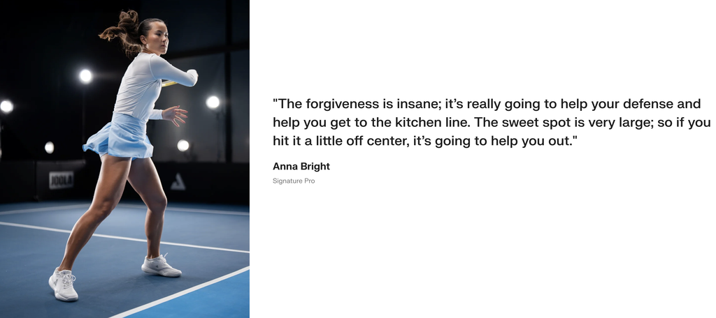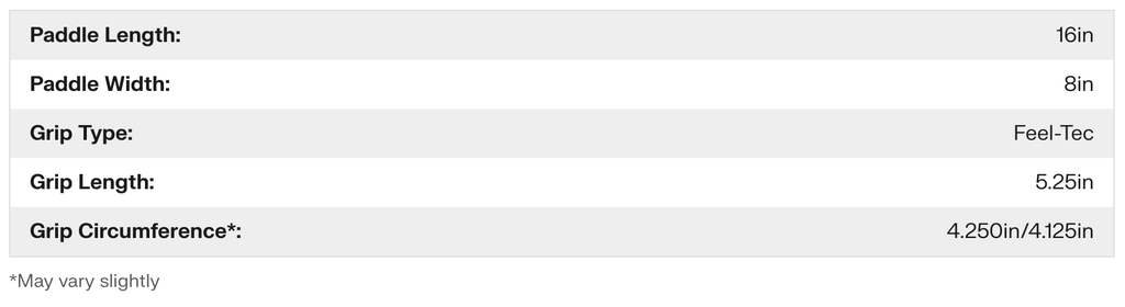 That's why it's the signature paddle of Anna Bright and Collin Johns. Go with Anna's 16mm paddle for a bit more weight (8.2oz) and a slimmer grip (4.125in) or choose Anna's 14mm paddle for a bit less weight (8.0oz) with the same slimmer grip (4.125in).