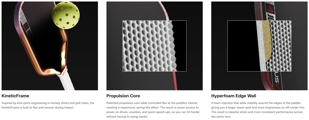Built into the paddle’s throat, the patent-pending KineticFrame flexes to absorb and redirect energy, benefiting softer hands in the transition zone and precise ball placement under pressure.